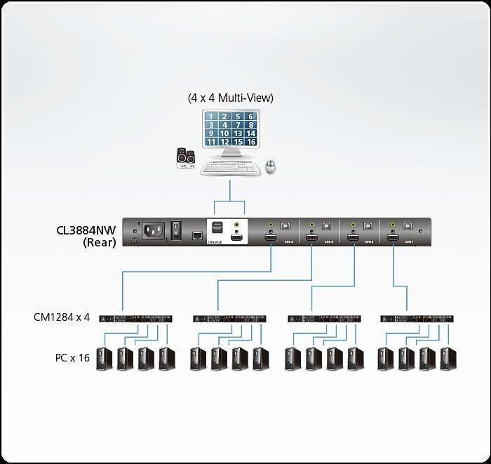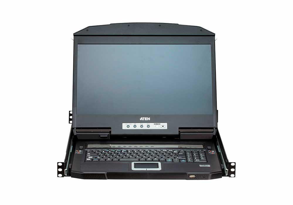 KVM-переключатель с широкоэкранным ЖК-дисплеем CL3884NW компании ATEN предлагает экономящий пространство, модернизированный подход к технологиям KVM-переключения, объединяя в монтируемом в стойку корпусе высотой 1U клавиатуру, тач-пад панель и 18,5 "ЖК-монитор со светодиодной подсветкой. Конструкция с двумя направляющими позволяет ЖК-монитору, клавиатуре и тач-пад панели работать независимо друг от друга. Если клавиатура и тач-пад панель не используются, то, для максимизации использования пространства они могут быть задвинуты обратно, При этом ЖК-монитор может быть развернут назад и ,находясь на одном уровне со стойкой, обеспечит удобный мониторинг деятельности компьютера. В KVM-переключателе CL3884NW осуществляется двойной консольный вывод, обеспечивающий пользователям наблюдение в режиме реального времени. Вы можете управлять обоими выводами, используя следующие режимы отображения: Quad View (видео-вывод с четырех компьютеров в одно окно), «изображение в изображении» (Picture in Picture, (PiP)), «изображение рядом с изображением» (Picture by Picture, (PbP), «изображение на изображении» (Picture on Picture,(PoP). Поддерживаются различные параметры макета режимов отображения, позволяя настроить необходимые источники для отображения. Кроме того, возможно подключение каскадом до 2 уровней, при котором CL3884NW может поддерживать до 16 одновременно отображаемых видеоисточников, управляемых независимой клавиатурой и мышью.