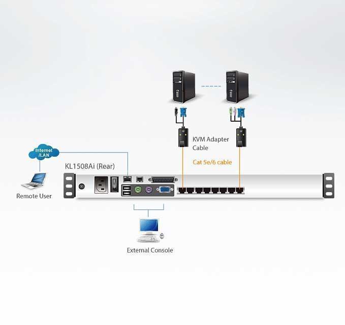 KVM-переключатель KL1508AiN обеспечивает возможность удобной работы, как на локальных рабочих местах системных администраторов, так и с удаленных рабочих мест, благодаря наличию у переключателя функции IP-доступа. Используя протокол TCP/IP для связи, KL1508AiN обеспечивает доступ с любого компьютера в сети LAN, WAN или Интернет.