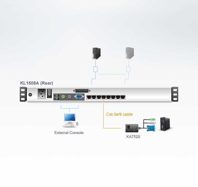 С целью повышения надежности соединения с компьютерами, а также для удобства монтажа используются разъемы RJ-45 и кабель категории 5e/6. Использование специальных KVM-Кабель-Адаптеров для соединения позволяет применять в установке с KL1508AN любые сочетания компьютеров PC, Mac и Sun, а также последовательные устройства.