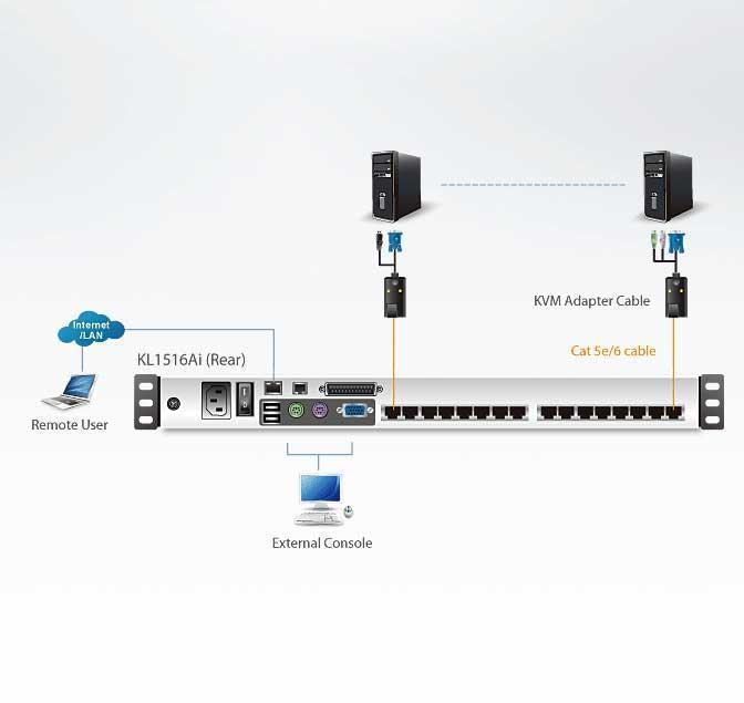 IP KVM switch KL1516AiM обеспечивает возможность удобной работы, как на локальных рабочих местах системных администраторов, так и с удаленных рабочих мест, благодаря наличию у переключателя функции IP-доступа. Используя протокол TCP/IP для связи, KL1516AiM обеспечивает доступ c любого компьютера в сети LAN, WAN или Интернет.