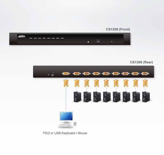 CS1308-AT-G – KVM переключатель ATEN CS1308 – устройство управления, которое обеспечивает доступ к 8 компьютерам с одной консоли (клавиатура, мышь, монитор), а при подключении каскадом* 8 дополнительных KVM переключателей CS1308 можно управлять 64 компьютерами. Переключатель поддерживает интерфесы USB и PS/2 для подключения консоли и компьютеров.Характеристики ATEN CS1308: