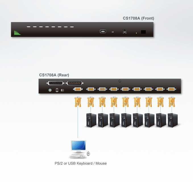 CS1708A-AT-G – KVM переключатель ATEN CS1708A – устройство управления несколькими компьютерами с одной PS/2 или USB консоли (клавиатура, монитор и мышь). Один переключатель CS1708A может управлять 8 компьютерами. Используя гирляндное подключение можно добавить 31 дополнительный переключатель, что позволяет управлять 256 компьютерами с одной консоли KVM (клавиатура, монитор и мышь). Кроме того, для каждого компьютера на передней панели имеется порт USB, позволяющий поочередно использовать любые подключенные к нему периферийные устройства.