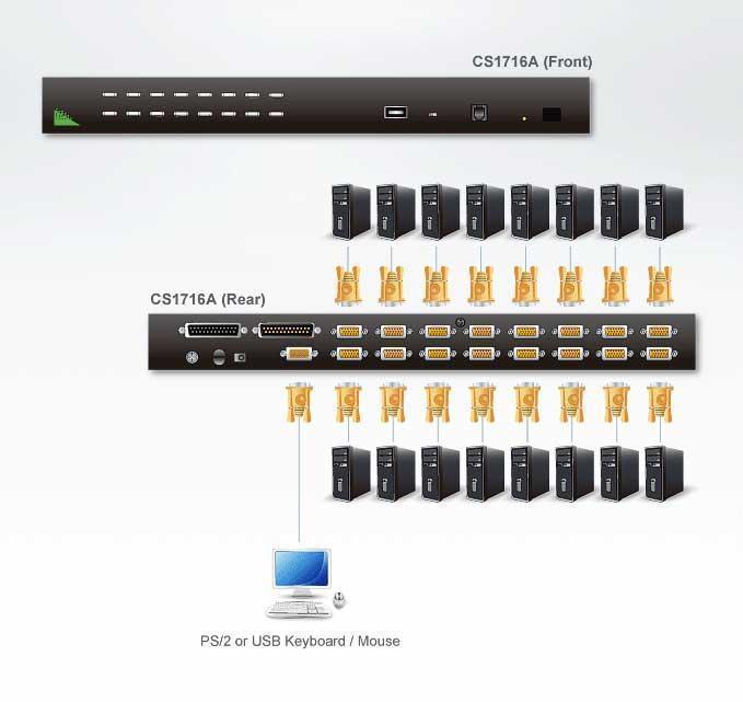 CS1716A-AT-G – KVM переключатель ATEN CS1716A – устройство управления несколькими компьютерами с одной PS/2 или USB консоли (клавиатура, монитор и мышь). Один переключатель CS1716A может управлять 16 компьютерами. Используя гирляндное подключение можно добавить 31 дополнительный переключатель, что позволяет управлять 512 компьютерами с одной консоли KVM (клавиатура, монитор и мышь). Кроме того, для каждого компьютера на передней панели имеется порт USB, позволяющий поочередно использовать любые подключенные к нему периферийные устройства.