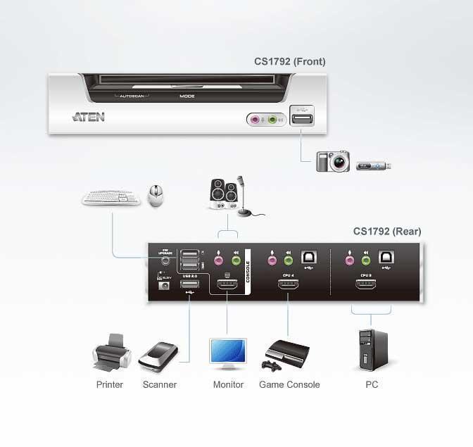 CS1792-AT-G – KVM Переключатель ATEN CS1792, совмещая в себе 2-портовый переключатель с 2-портовым USB 2.0-концентратором, обеспечивает быстрое переключение сигнала HDMI между 2 ПК или другими устройствами с поддержкой HDMI, такими как игровые консоли, и позволяет пользователям совместно использовать периферийные устройства USB с единой консоли.Переключатель CS1792 позволяет легко переключаться между устройствами при помощи кнопок на передней панели и горячих клавиш на клавиатуре, а также обладает функцией Video DynaSync™, обеспечивающий постоянное оптимальное разрешение для устройств HDMI. Кроме того, поддержка цифрового аудио позволяет CS1792 обеспечивать высококачественный звук, такой как Dolby True HD и DTS HD Master Audio.