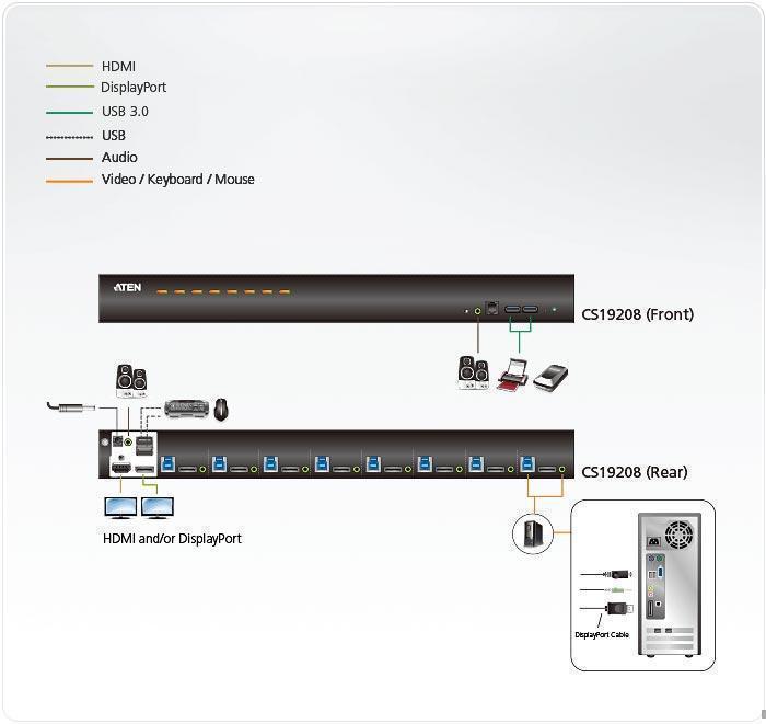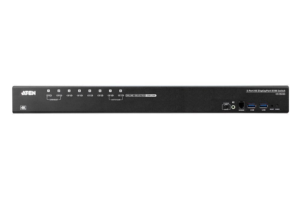 8-портовый KVM-переключатель CS19208 с интерфейсом USB 3.0 и 4K DisplayPort, компании ATEN, может эффективно получать доступ к 8 компьютерам DisplayPort и управлять ими с помощью одной USB-клавиатуры, USB-мыши и консоли монитора.