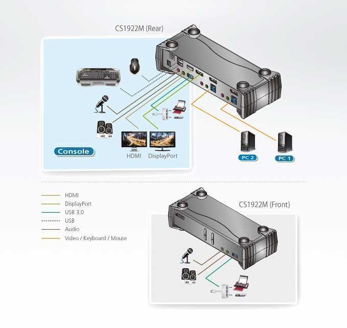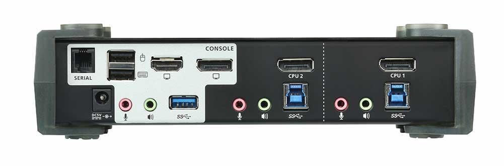 Управление с единой консоли, оснащенной одной USB-клавиатурой/мышь и монитором с DisplayPort или HDMI, двумя компьютерами и двумя периферийными USB-устройствами