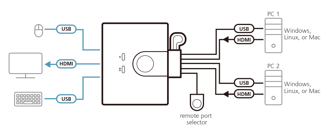 - Управление двумя компьютерами с интерфейсами USB и HDMI с помощью одной KVM-консоли