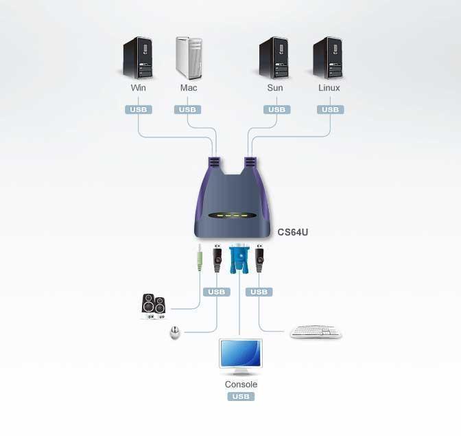 CS64UZ-AT – 4 портовый USB KVM переключатель ATEN CS64U с интегрированными в корпус 4 интерфейсными шнурами и встроенным USB хабом. С помощью CS64U можно управлять четырьмя компьютерами (серверами) с одной KVM консоли.Функциональные особенности ATEN CS64U: