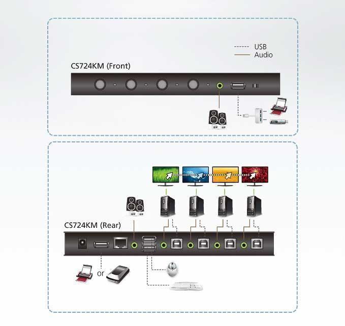 Дополнительные расширенные функции CS724KM включают режим шины питания, что означает, что не требуется внешний адаптер питания, а также независимое переключение клавиатуры / мыши, периферийных устройств и аудиофокуса с помощью горячих клавиш. Обладая богатым набором функций, CS724KM предназначен для упрощения административных задач, экономии места и повышения производительности труда в многоэкранных расширенных средах рабочего стола и особенно подходит для сложных многозадачных приложений в диспетчерских в любой отрасли.