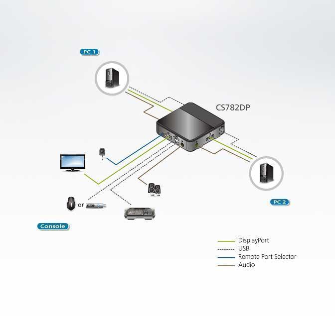 - Управление двумя компьютерами с портами USB с единой консоли, оснащенной видеоинтерфейсом DisplayPort