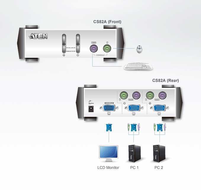 CS82AC-A7 – KVM Переключатель ATEN CS82A с консольными портами (клавиатуры и мыши) PS/2 на передней и задней панелях. С помощью переключателя можно управлять 2 компьютерами c одной KVM консоли. Переключаться между компьютерами можно кнопками на лицевой панели переключателя или комбинацией клавиш на клавиатуре.Характеристики ATEN CS82A: