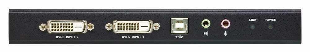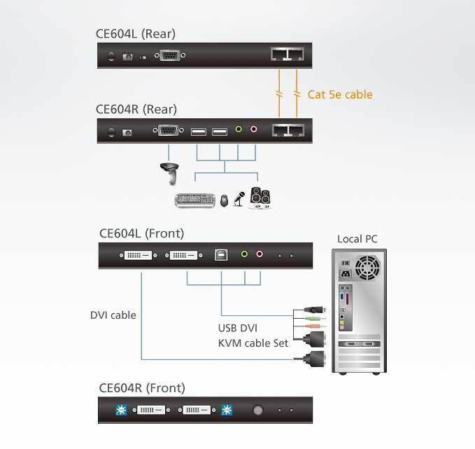- Передача сигналов динамика, клавиатуры, мыши, DDC и одного DVI через один кабель Cat 5e, а RS-232, микрофона и другого DVI через второй кабель Cat 5e