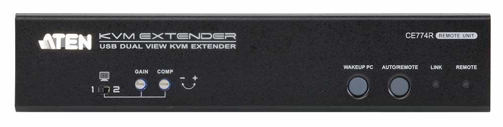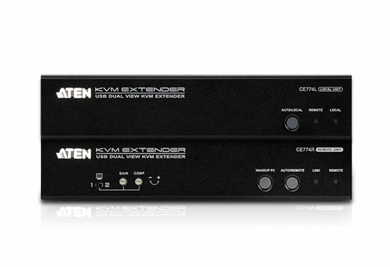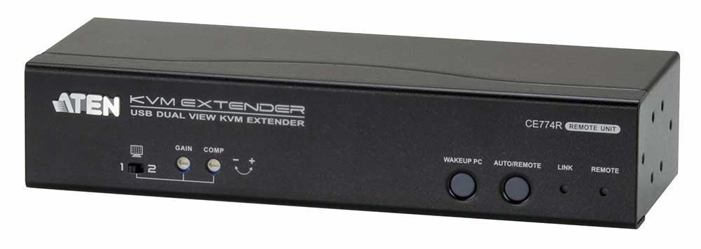 CE774-AT-G – KVM Удлинтетель ATEN CE774 обеспечивает доступ к компьютерной системе с консоли, удаленной на расстояние до 150 метров. Функция Dual View позволяет передать видеосигнал от видеокарты с двумя выходами на два удаленных монитора. C помощью функции PC Wake-UP, можно выводить ПК из спящего режима удаленно, простым нажатием кнопки на удаленном модуле CE774R. Эта функция обеспечивается передачей специального сигнала на порт RS232 подключенного компьютера и благодаря ей, нет необходимости пользователю быть в непосредственной близости с компьютером, чтобы его включить.В переднюю панель модуля CE774R удлинителя встроены регуляторы тюнера для подстройки качества изображения.