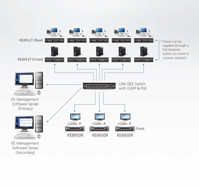 HDMI KVM-удлинитель KE8952 состоит из блока передатчика KE8952T-AX-G, который подключается к компьютеру и блока приемника KE8952R-AX, обеспечивающего консольный доступ из отдельного местоположения. Доступ к компьютеру с удаленной консоли осуществляется по стандартной TCP/IP-сети с использованием кабеля Cat.5e, что позволяет выполнять администрирование по принципам: точка – точка (point-to-point), точка – многоточка (point-to-multipoint), многоточка – точка (multipoint-topoint), многоточка – многоточка (multipoint-to-multipoint). Блоки KE8952 можно подключать либо напрямую друг к другу, либо через высокоскоростную сеть на основе меди или оптоволокна.