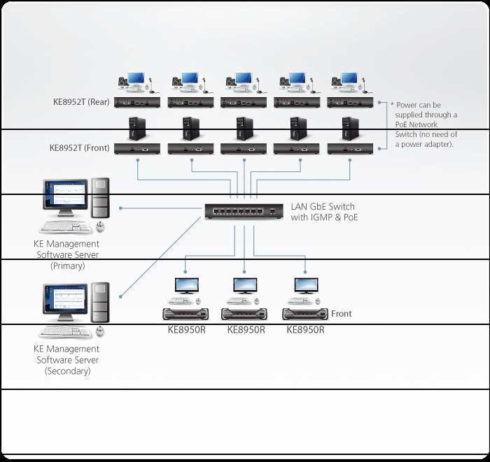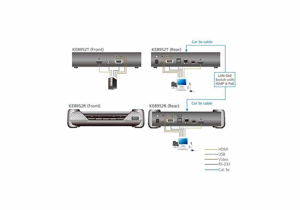 HDMI KVM-удлинитель KE8952 состоит из блока передатчика KE8952T-AX который подключается к компьютеру и блока приемника KE8952R-AX-G, обеспечивающего консольный доступ из отдельного местоположения. Доступ к компьютеру с удаленной консоли осуществляется по стандартной TCP/IP-сети с использованием кабеля Cat.5e, что позволяет выполнять администрирование по принципам: точка – точка (point-to-point), точка – многоточка (point-to-multipoint), многоточка – точка (multipoint-topoint), многоточка – многоточка (multipoint-to-multipoint). Блоки KE8952 можно подключать либо напрямую друг к другу, либо через высокоскоростную сеть на основе меди или оптоволокна.