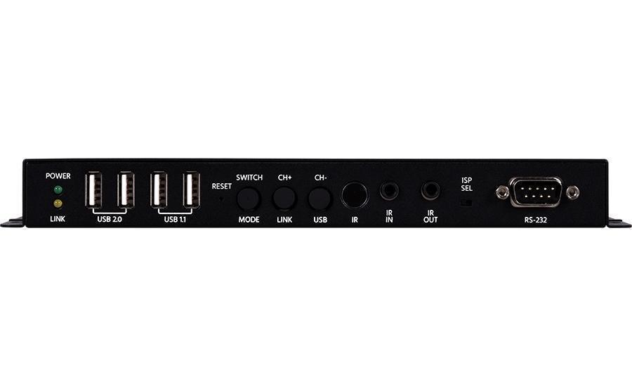 Приемник KVM-сигналов HDMI 2.0 4K/60 (4:2:0), VGA (D-Sub-15) 1920х1200, аудиостерео (miniJack 3,5 мм), цифрового аудио (TOSLINK), ИК (2х miniJack 3,5 мм), 2хUSB 2.0, 2хUSB 1.1 и RS-232 (D-Sub-9) из 1000BaseT (3xRJ45), передатчик микрофона (miniJack 3,5 мм), питание от блока питания или по PoE, расстояние приема до 100 м, управление по IP (Telnet или web-интерфейс).