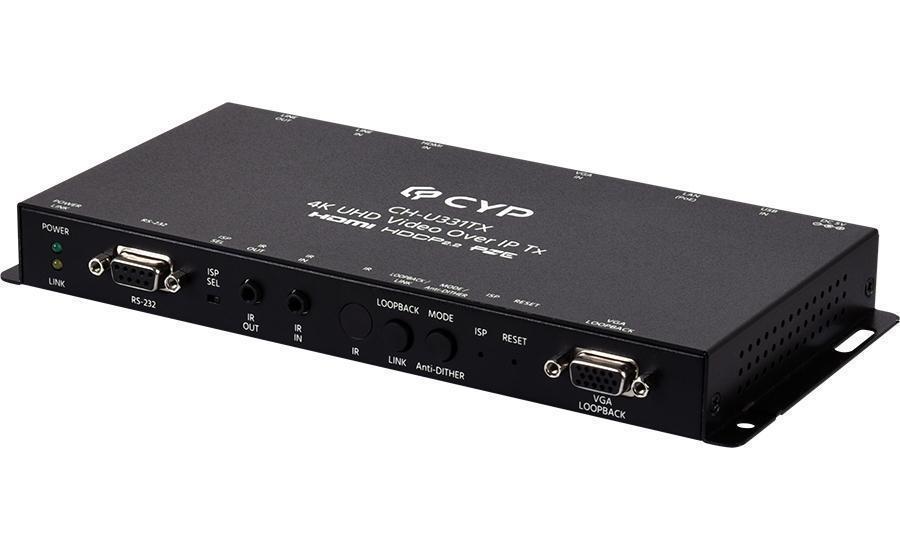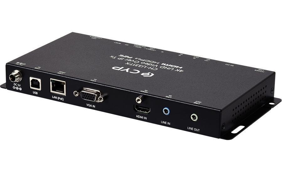 CH-U331TX – передатчик сигналов HDMI 2.0 разрешением до 4K/60 (4:2:0), VGA (D-Sub-15 с проходным выходом) разрешением до 1920х1200, двунаправленных сигналов аудиостерео (2х miniJack 3,5 мм), двунаправленных сигналов управления ИК (2х miniJack 3,5 мм), сигналов USB и RS-232 (D-Sub-9) по сети Ethernet 1000BaseT. Устройство обеспечивает возможность поворота изображения для видеостен на 180 или 270°. Питание устройства осуществляется от блока питания или по PoE, расстояние передачи сигналов – до 100 метров. Прибор управляется по IP (Telnet или через web-интерфейс).