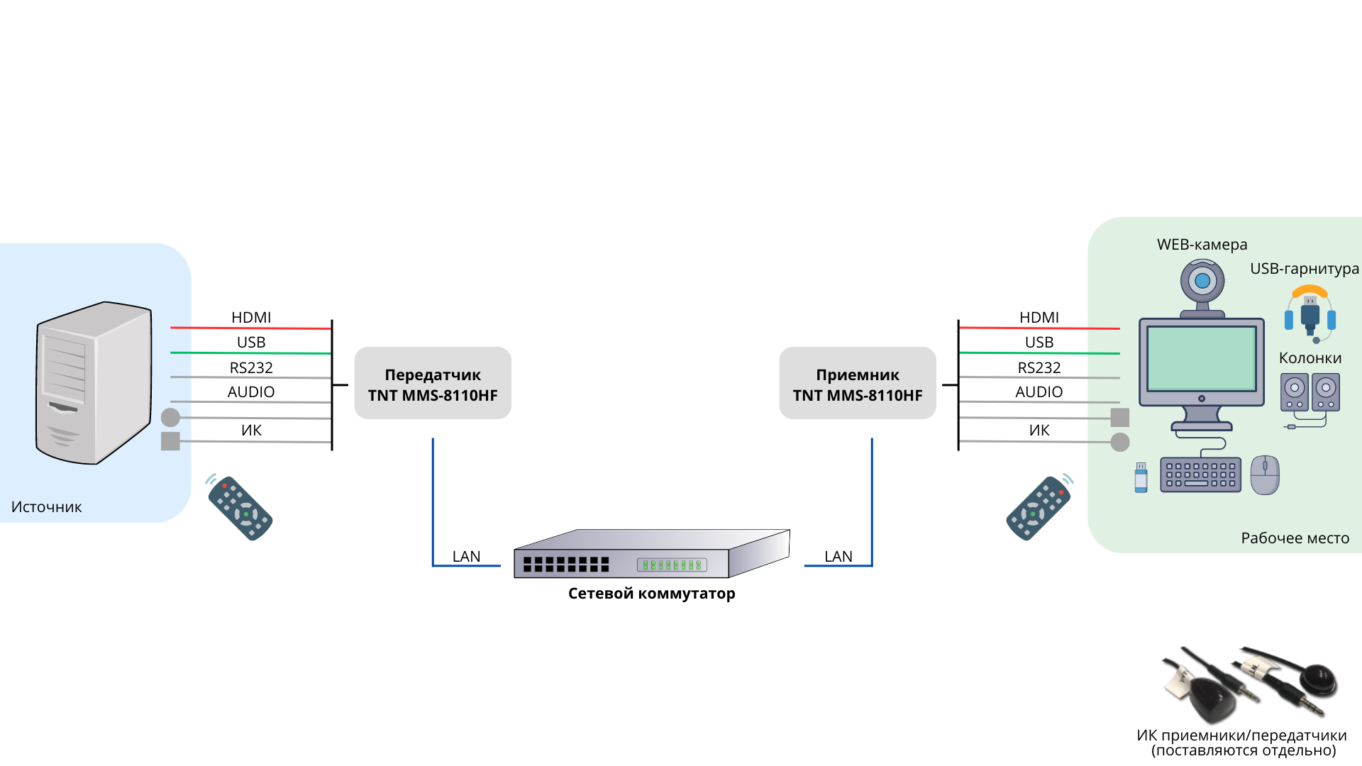Удлинитель обеспечивает передачу всех основных мультимедийных данных, необходимых оператору на рабочем месте: видео, USB клавиатура и мышь, USB периферия (USB 2.0), микрофон с колонками или гарнитурой, RS232, ИК.