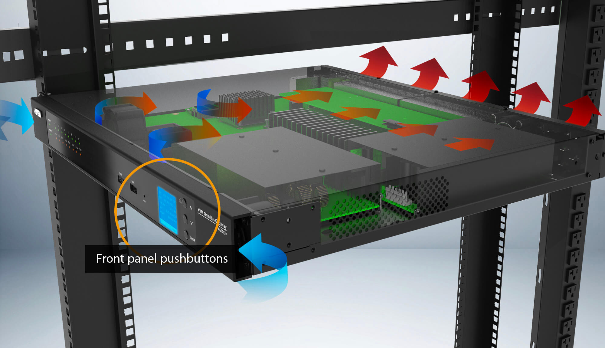 В OmniBus KVM-шлюзе с доступом по IP используются четыре интеллектуальных модуля вентиляторов серверного уровня, которые обеспечивают всестороннюю эффективность протекания воздушного потока и повышают надежность системы. При нахождении системы в режиме ожидания или при небольшой нагрузке, вентилятор работает с низким уровнем шума, менее 40 дБА. Кнопки на передней панели можно использовать для быстрой настройки устройства, своевременного устранения неполадок и выполнения перезагрузки системы в нештатных ситуациях. Для защиты настроек системы от несанкционированного доступа кнопки могут быть заблокированы.