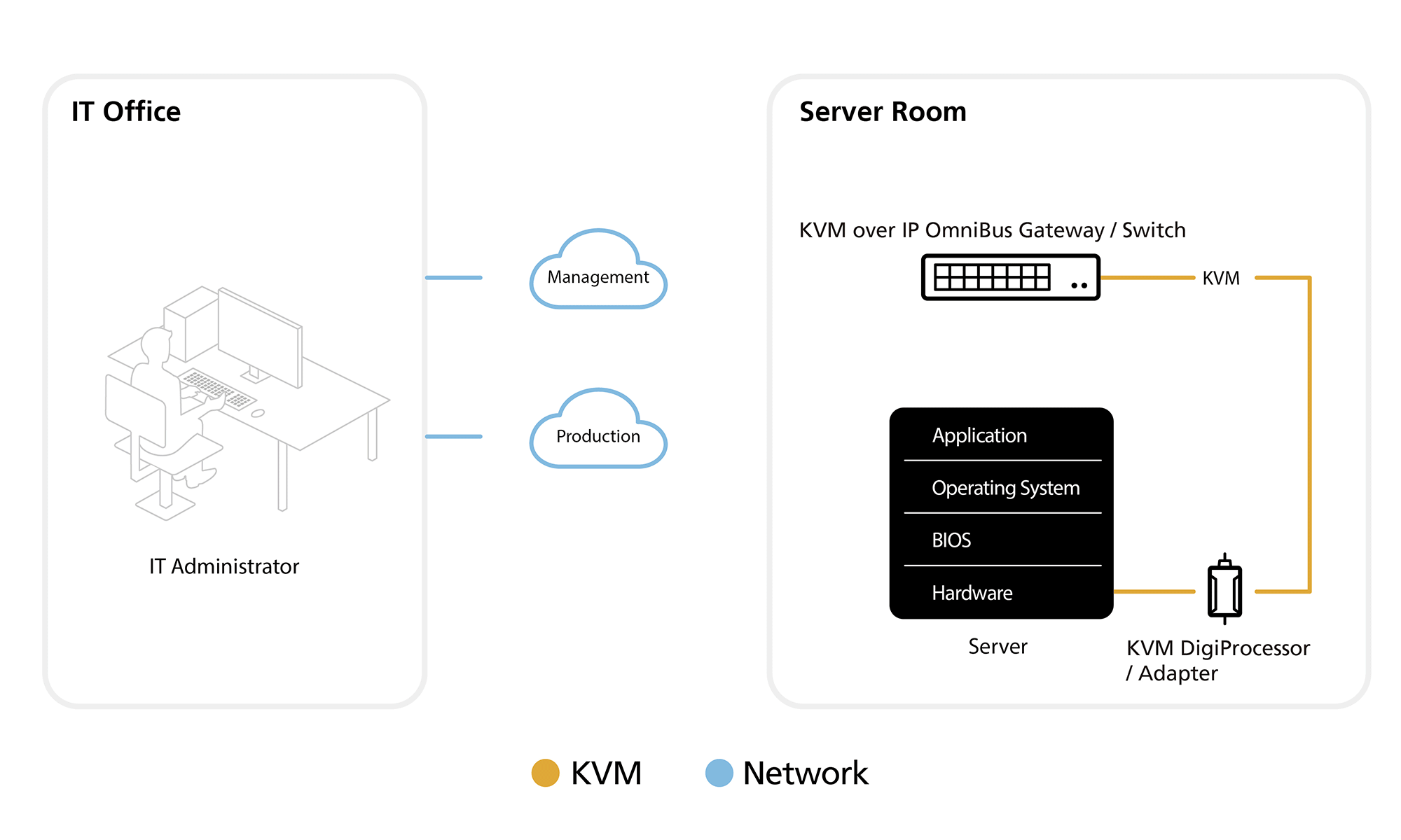 При разделении сетей для управления и производства OmniBus KVM-шлюз с доступом по IP, подключенный к сети управления, позволяет ИТ-оператору своевременно выполнять устранение неполадок. Например, устанавливать исправления для программного обеспечения, обновлять образы, совершать перезагрузки. А также, во время не загруженности производственной сети, проводить обслуживание системы серверов на уровне BIOS. В случае непредвиденных обстоятельств такой подход может служить в качестве экстренной меры, обеспечивая при этом от начала до конца безопасность данных и течение рабочего процесса.