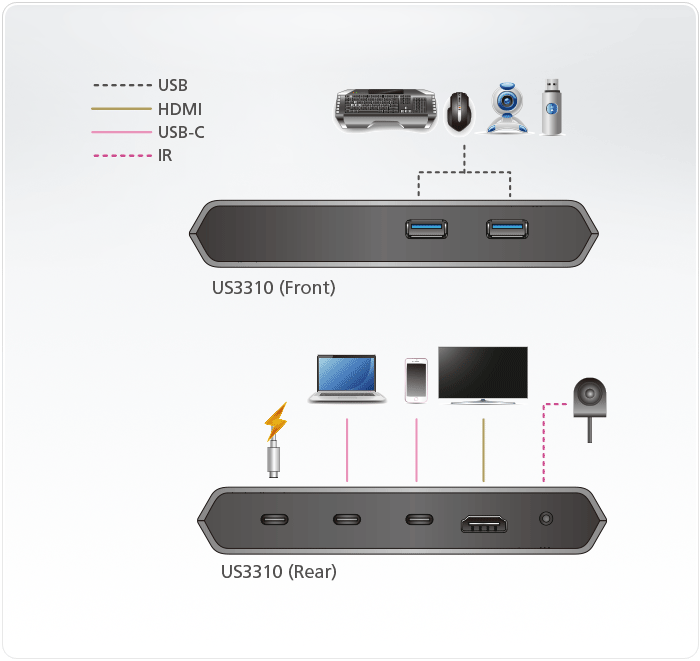 - 1x US3310 2-портовый USB-C Gen 1 Док-коммутатор с функцией Power Pass-through