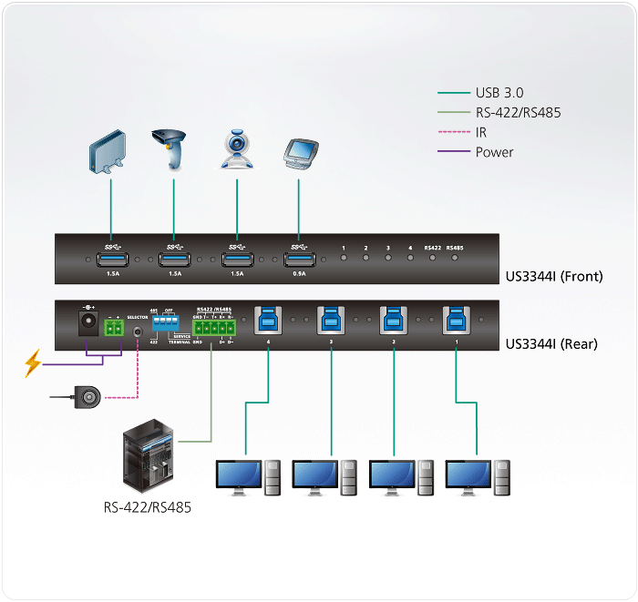 Использование промышленного USB Переключателя US3344I поможет избежать затрат на установку отдельных систем и оборудования для каждого компьютера. Его конструкция с металлическим корпусом и возможностью крепления, как на стену, так и в стойку, подходит для промышленных условий. Дополнительные возможности управления реализованы с помощью традиционного последовательного соединения RS-422/RS-485.